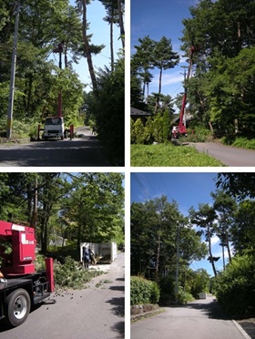 - 他の樹木や電線に倒れて影響を与えないように、上部からの幾度かに分けた伐採。